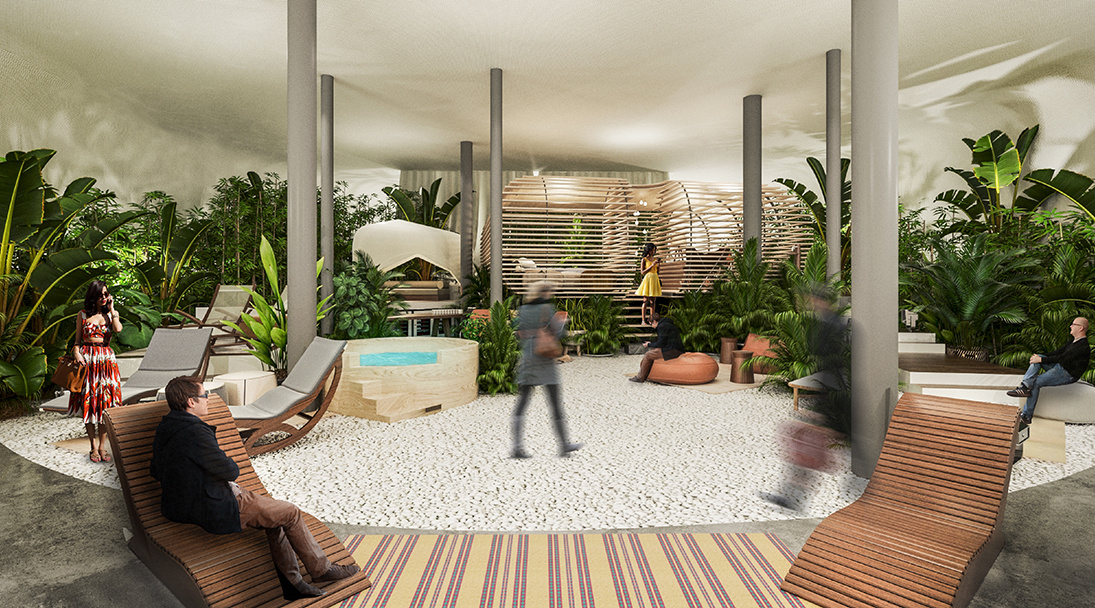 Στον «υπαίθριο» χώρο, ο επισκέπτης βρίσκει σημεία συνάντησης, συζήτησης, στάσης και χαλάρωσης. Τα αντικείμενα που εξυπηρετούν τους επισκέπτες και τις ανάγκες τους αφορούν στην ιδέα του υπαίθριου πολυτελούς τουρισμού.